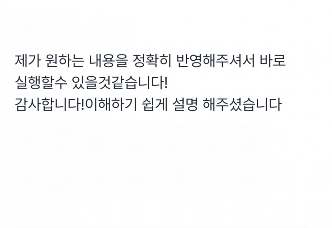 제가 원하는 내용을 정확히 반영해주셔서 작성자관리자 등록일 25-08-25 조회53회 본문 제가 원하는 내용을 정확히 반영해주셔서 바로 실행할수 있을것같습니다! 감사합니다!이해하기 쉽게 설명 해주셨습니다 상담선생님덕에 진짜 위로도되고 알수 없는 문제의 내용을 스스로 발견할 수 있도록 끌어내여 목록 글쓰기