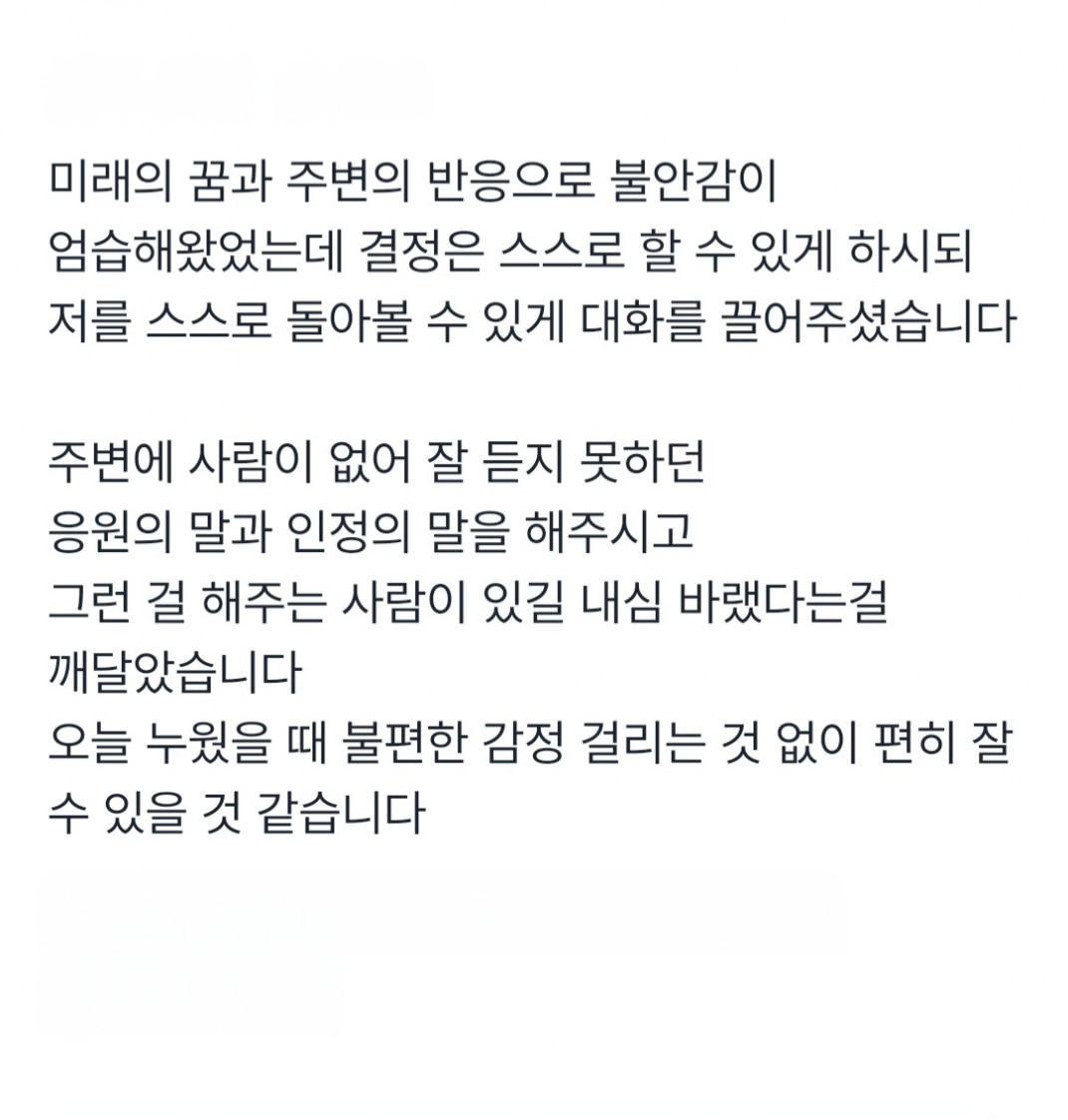 미래의 꿈과 주변의 반응으로 불안감이 엄습해왔었는데 작성자관리자 등록일 25-08-25 조회55회 본문 미래의 꿈과 주변의 반응으로 불안감이 엄습해왔었는데 결정은 스스로 할수 있게 하시되 저를 스스로 돌아볼 수 있게 대화를 끌어주셨습니다 세심한 상담감 사합니다..^^ 친절하시고 상냥하게 응대해주십니다. 목록 글쓰기