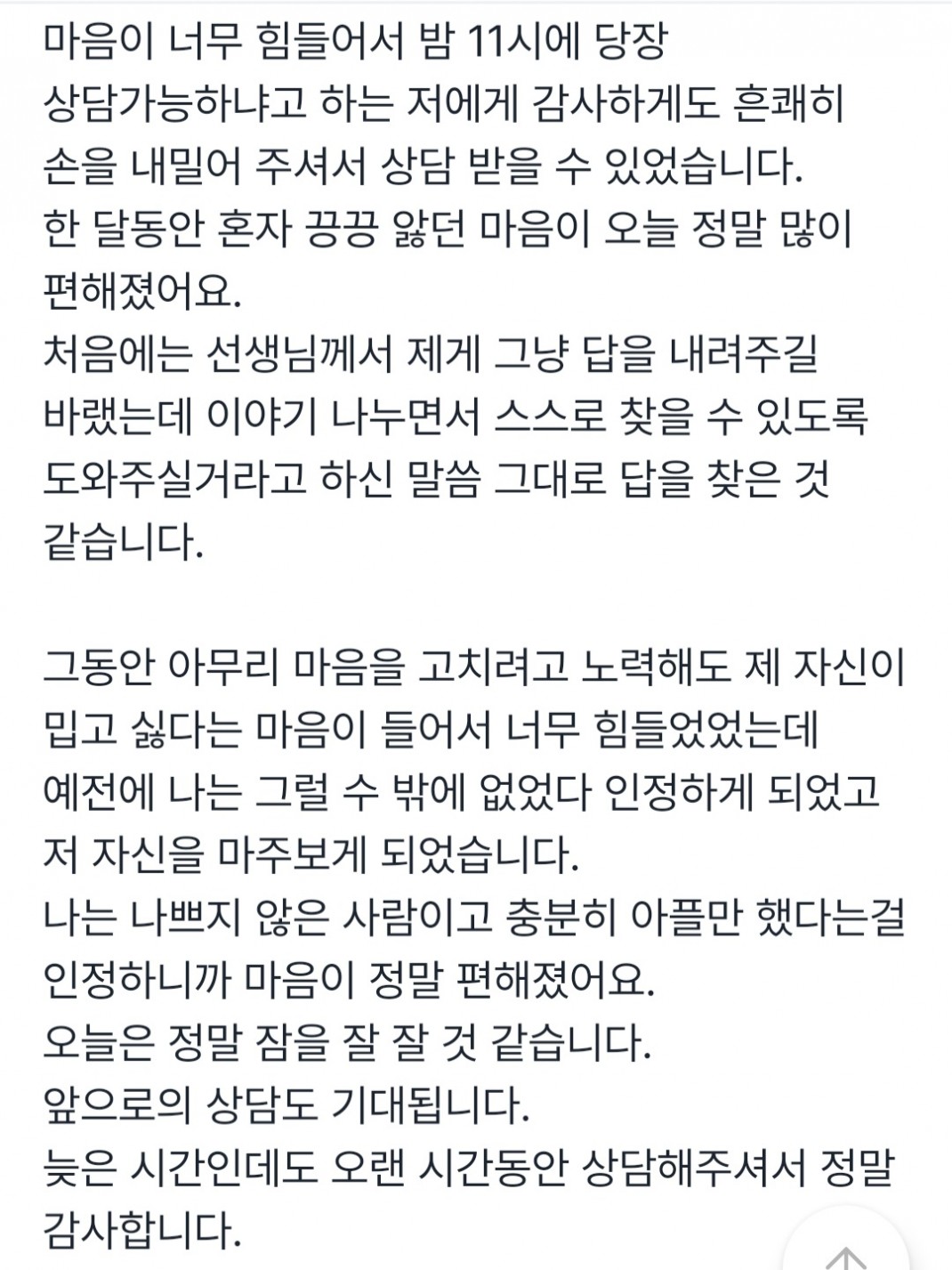 마음이 너무 힘들어서밤 11시에 작성자관리자 등록일 25-08-25 조회56회 본문 마음이 너무 힘들어서밤 11시에 당장 상담가능하냐고 하는 저에게 감사하게도 흔쾌히 손을 내밀어 주셔서 상담 받을 수 있었습니다. 저는 다음상담때 제가 해야 하는 숙제가 생겨서 좋았습니다. 오늘은 이 답답한 감정을 더이상은 느끼기 싫어서 목록 글쓰기