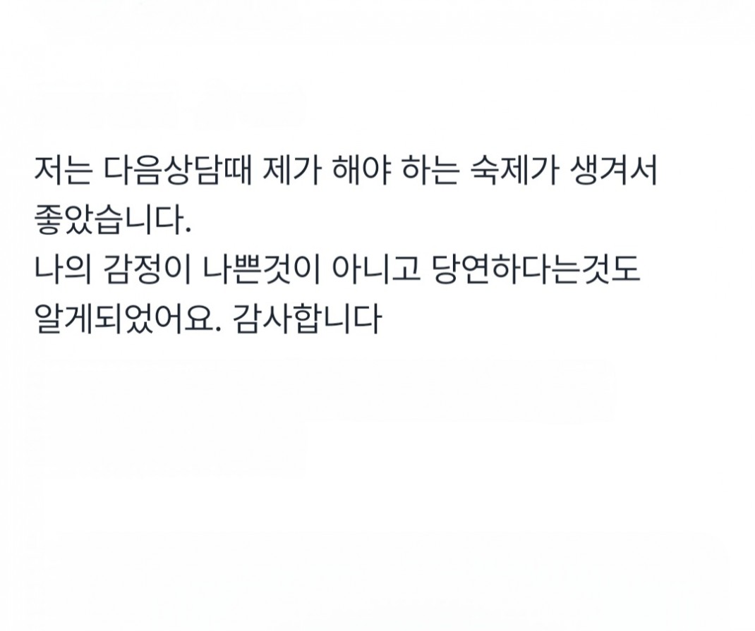 저는 다음상담때 제가 해야 하는 숙제가 생겨서 좋았습니다. 작성자관리자 등록일 25-08-25 조회57회 본문 저는 다음상담때 제가 해야 하는 숙제가 생겨서 좋았습니다. 나의 감정이 나쁜것이 아니고 당연하다는것도 알게되었어요. 감사합니다 조울증과 분노조절장애가 너무 심하여 신청하게되었고 마음이 너무 힘들어서밤 11시에 목록 글쓰기
