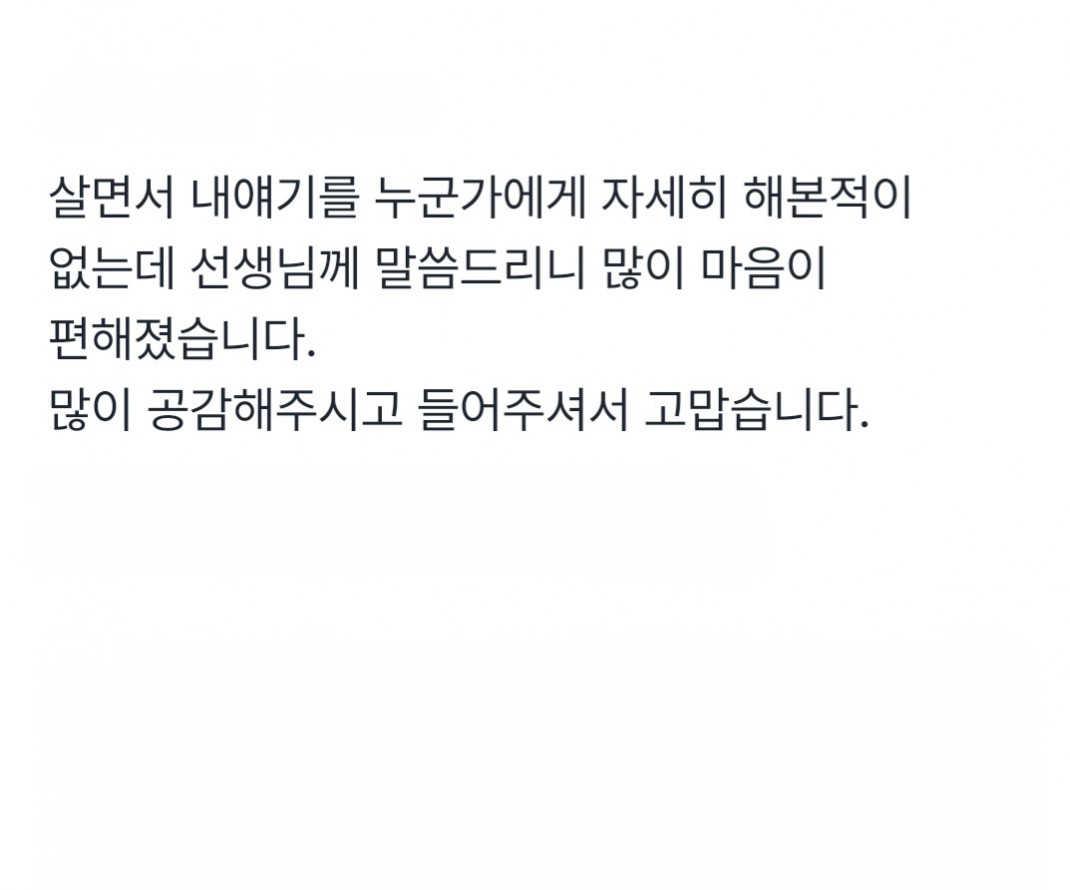 살면서 내얘기를 누군가에게 자세히 해본적이 없는데 작성자관리자 등록일 25-08-25 조회70회 본문 살면서 내얘기를 누군가에게 자세히 해본적이 없는데 선생님께 말씀드리니 많이 마음이 편해졌습니다. 마음이 안정되고 잘들어 주시고 차분하게 상담해주셔서 따뜻한 말씀들 감사했습니다! 목록 글쓰기
