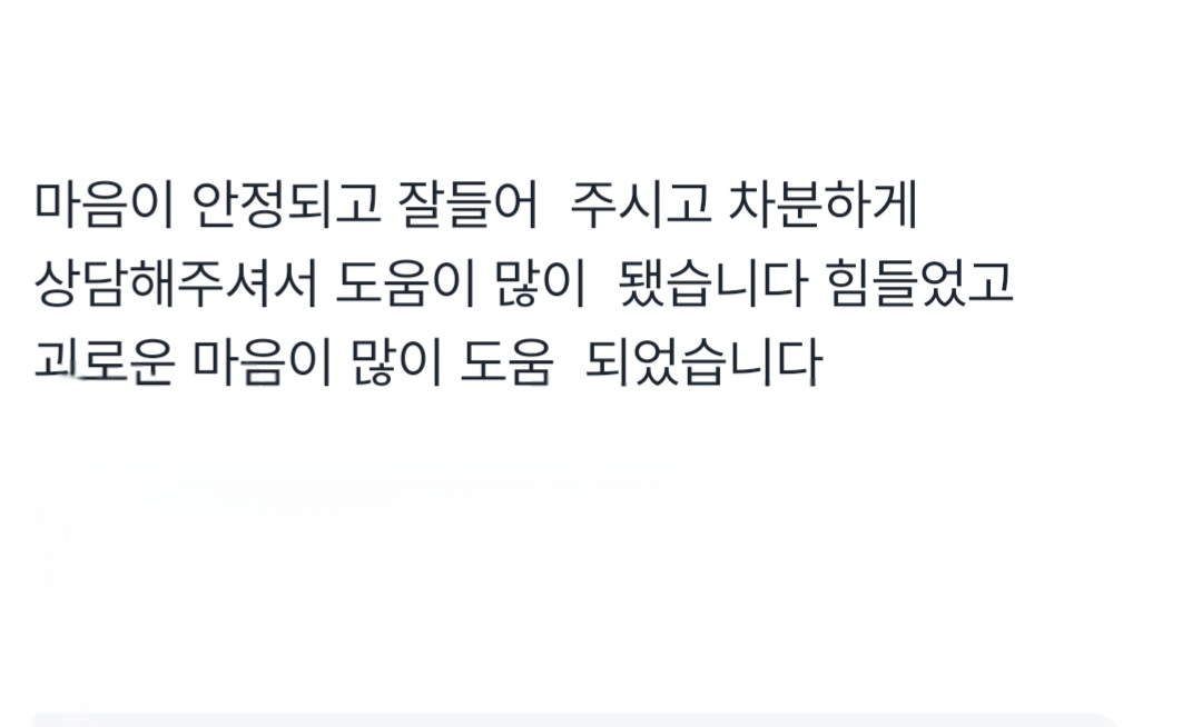 마음이 안정되고 잘들어 주시고 차분하게 상담해주셔서 작성자관리자 등록일 25-08-25 조회74회 본문 마음이 안정되고 잘들어 주시고 차분하게 상담해주셔서 도움이 많이 됐습니다 힘들었고 괴로운 마음이 많이 도움 되었습니다 오늘밤9시 정해진시간에 상담을했네요. 살면서 내얘기를 누군가에게 자세히 해본적이 없는데 목록 글쓰기