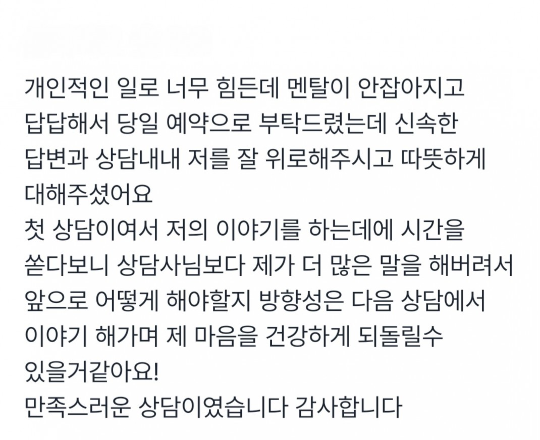 개인적인 일로 너무 힘든데 멘탈이 안잡아지고 답답해서 당일 예약으로 부탁드 렸는 작성자관리자 등록일 25-08-24 조회53회 본문 개인적인 일로 너무 힘든데 멘탈이 안잡아지고 답답해서 당일 예약으로 부탁드 렸는데 신속한 답변과 상담내내 저를 잘 위로해주시고 따뜻하게 대해주셨어요 상담을 통해 자존감도 많이 올라간 것 갇습니다. 심리상담을 통해 제 인생 이야기를 처음부터 끝까지 털어놓을 수 있었습니다. 목록 글쓰기