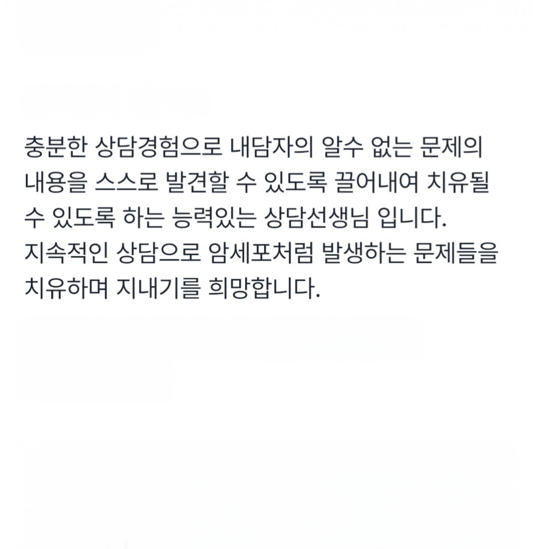 알수 없는 문제의 내용을 스스로 발견할 수 있도록 끌어내여 작성자관리자 등록일 25-08-25 조회56회 본문 충분한 상담경험으로 내담자의 알수 없는 문제의 내용을 스스로 발견할 수 있도록 끌어내여 치유될 수있도록 하는 능력있는 상담선생님 입니다. 제가 원하는 내용을 정확히 반영해주셔서 차분하게 끝까지 경청해주시고 공감해주셔서 목록 글쓰기