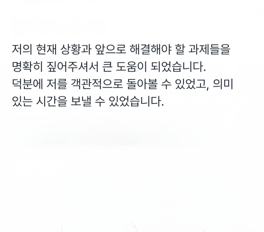 저의 현재 상황과 앞으로 해결해야 할 과제들을 명확히 짚어주셔서 작성자관리자 등록일 25-09-03 조회84회 본문 저의 현재 상황과 앞으로 해결해야 할 과제들을 명확히 짚어주셔서 큰 도움이 되었습니다. 덕분에 저를 객관적으로 돌아볼 수 있었고, 의미 있는 시간을 보낼 수 있었습니다. 불안감이 심해서 몇년을 혼자 끙끙 앓다가 누구에도 속마음을 들어내지 못했는데 목록 글쓰기