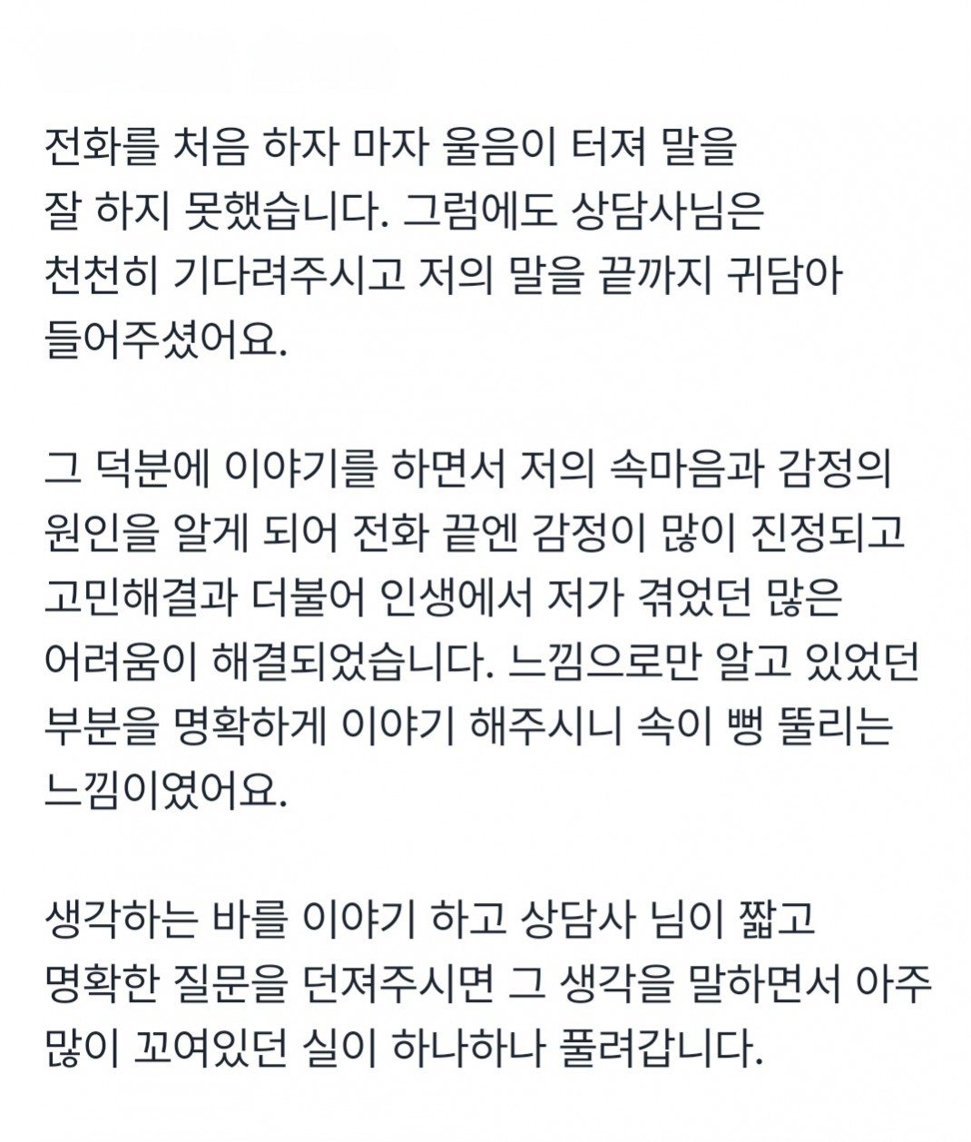 전화를 처음 하자마자 울음이 터져 말을 잘 하지 못했습니다. 그럼에도 상담사님은 천천히 기다려주시고 저의 말을 끝까지 귀담아 들어주셨어요.그 덕분에 이야기를 하면서 저의 속마음과 감정의 원인을 알게 되어 전화 끝엔 감정이 많이 진정되고 고민해결과 더불어 인생에서 저가 겪었던 많은 어려움이 해결되었습니다. 느낌으로만 알고 있었던 부분을 명확하게 이야기 해주시니 속이 뻥 뚫리는 느낌이였어요.